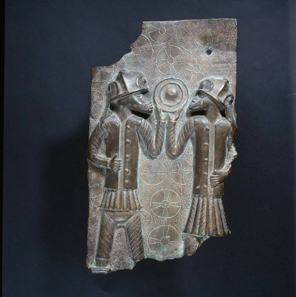 Our plaque depicts two Portuguese men holding “neptunes,” copper disks which the Portuguese traded for slaves, ivory, and other goods, and which, because of their value to the Benin royal metalsmithing guild, were used as currency among the Edo. The Portuguese were readily accepted in Benin: they represented the wealth and power the divine oba (king) was able to bring to his people,[2] (a fulfillment of the king’s association with the spirit of the sea, Olukun, bringer of wealth). The Portuguese were said to have provided troops for the conquest of the neighboring Igala kingdom during the reign of oba Esigie in the 16th century. Trade was mutually beneficial, and the Portuguese made no efforts to dislocate the king’s authority. Favorable representations of the Portuguese are well-documented, with the tradition of showing them in 16th or 17th century dress, often armed, helmeted, and long-haired.[3]