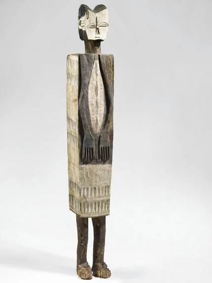 The “efomba” reliquary figure of the Ngata people is an example of an extremely rare African funereal form.[1] These bigger-than-life, anthropomorphized figures have been reported to be both coffins for burial and commemorative statues to honor important ancestors.[2] Many have a strictly rectilinear, elongated torso with more naturalistic appendages projecting from this box-like body, and have a large rectangular compartment carved into their backs, suggestive of a space for remains. At nearly 7 feet tall, our imposing male figure is probably the likeness of an important village elder commissioned prior to his death.[3]